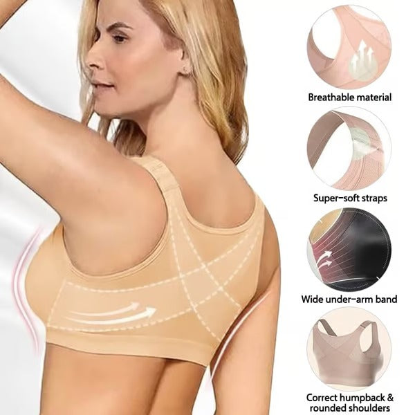The design of 5D seamed cups, wide side wings, strong cushioned shoulder straps, and U-shape back panel ensures maximum support against sagging while smoothing back bulges and correcting armpit fats for a flattering silhouette.