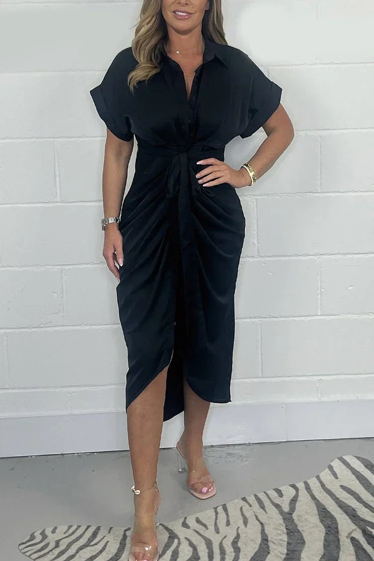 Experience the versatility and style of the Solid Color Shirt Dress. This classic and timeless dress is the perfect choice for those looking for a casual yet elegant look for everyday wear or special occasions.