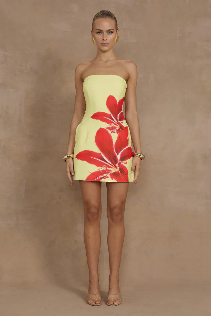 Our Tropical Mini Dress is your staple strapless mini with feminine floral placements for a fun refresh.